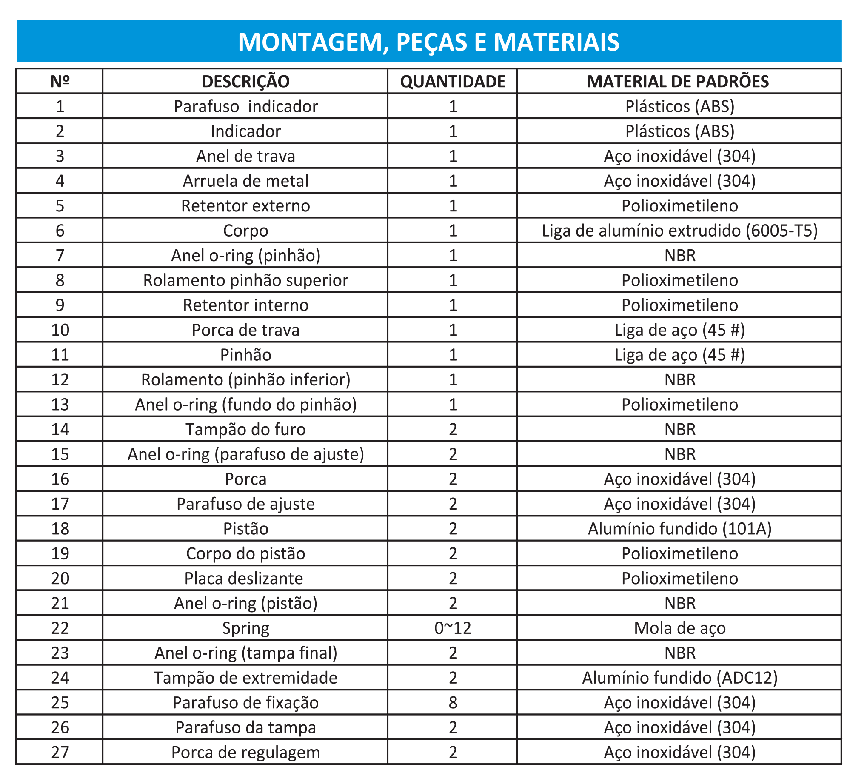 5. Pistões: Os pistões de cremalheira gémea são fabricados em alumínio de fundição tratado com anodização dura ou fabricado em aço fundido com galvanização. Posição de montagem simétrica, ciclo de vida longo e operação rápida, invertendo a rotação simplesmente invertendo os pistões.